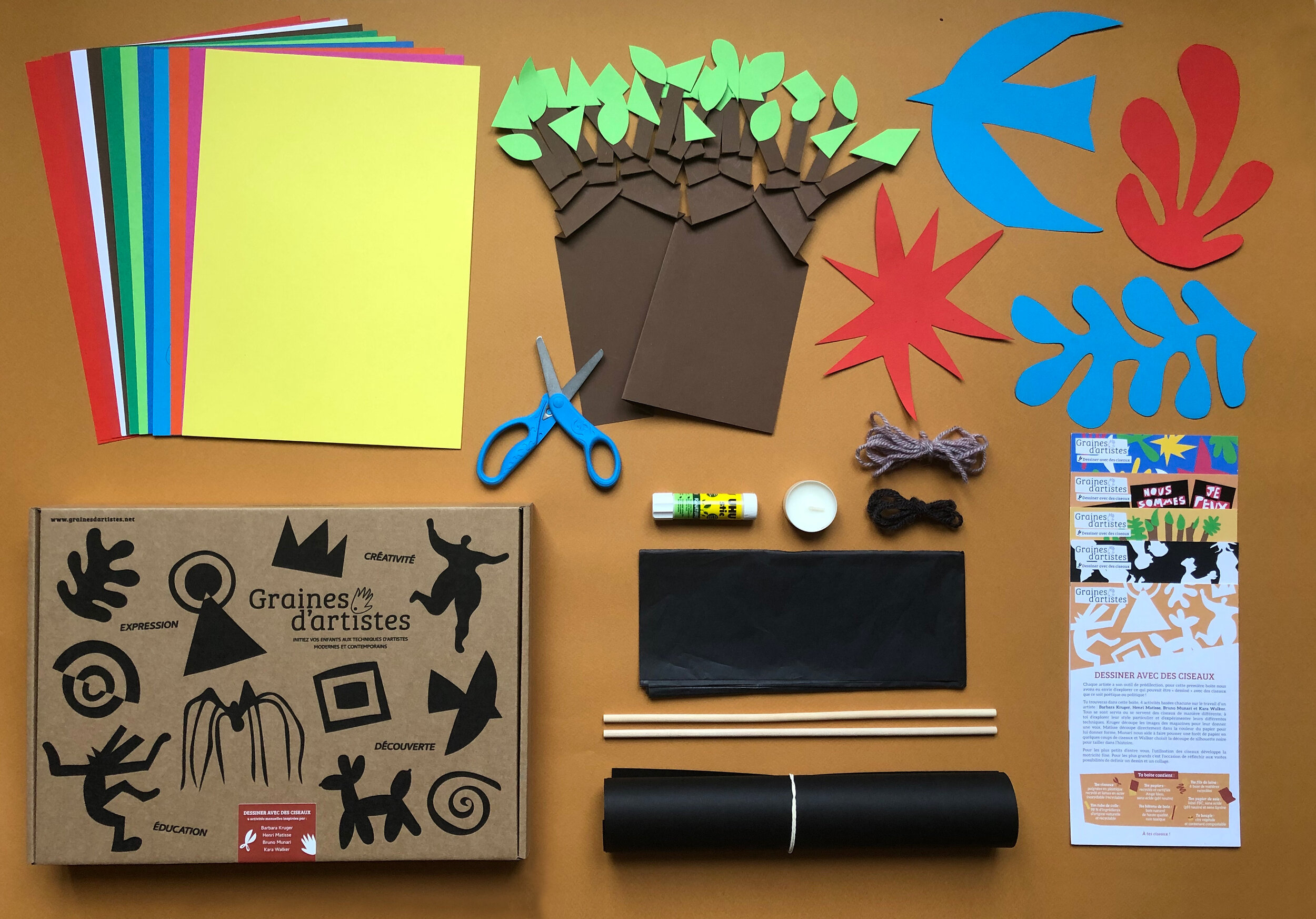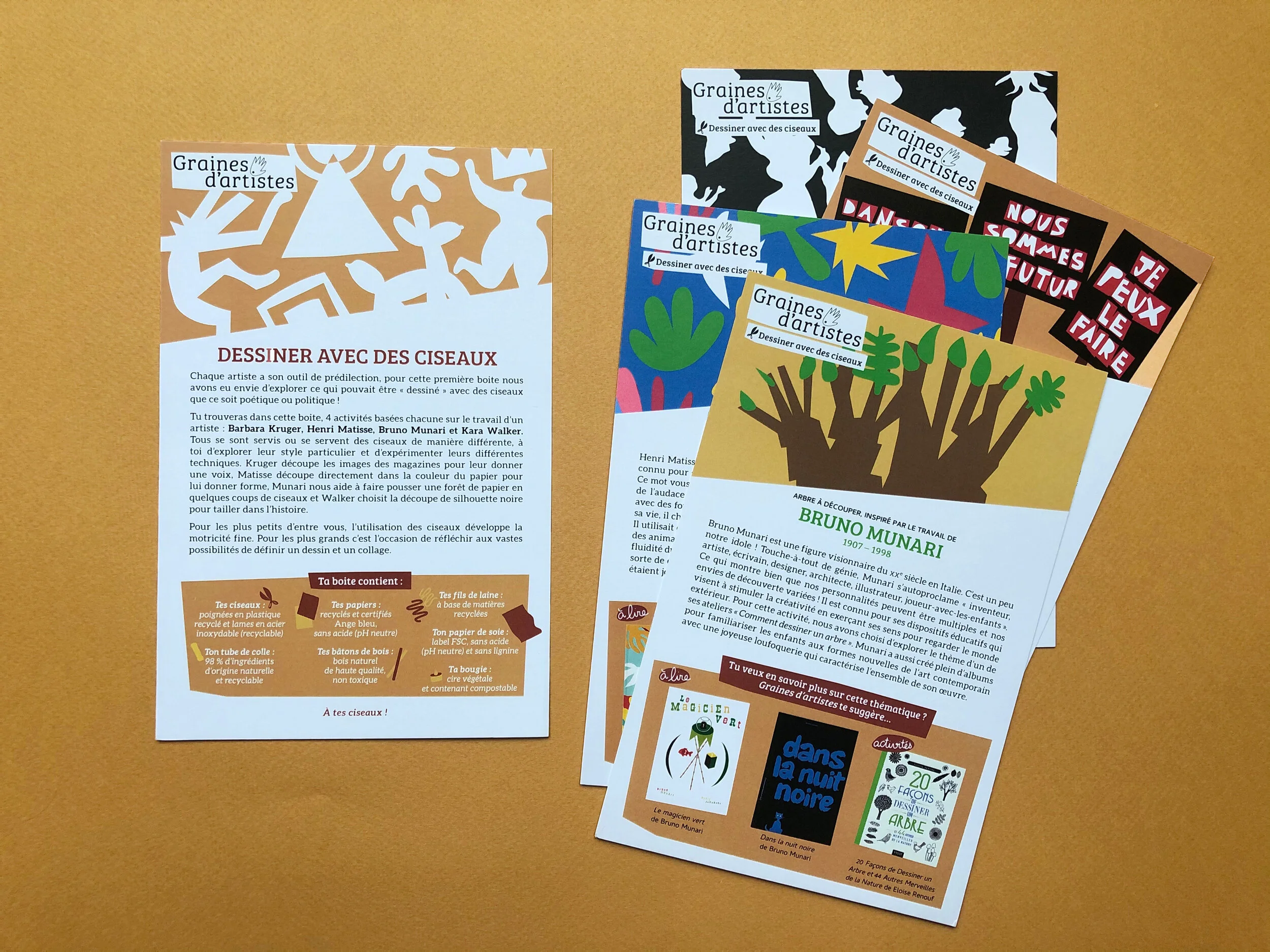 Vous trouverez dans cette boite, 4 ateliers basés chacun sur le travail d’un artiste : Barbara Kruger, Henri Matisse, Bruno Munari et Kara Walker. Tous se sont servis ou se servent des ciseaux de manière différente, à vous d’explorer leur style particulier et d'expérimenter leur différentes techniques ! Pour les plus petits, l’utilisation des ciseaux développe leur motricité fine et pour les plus grands c’est l’occasion de réfléchir aux vastes possibilités de définir un dessin et un collage.