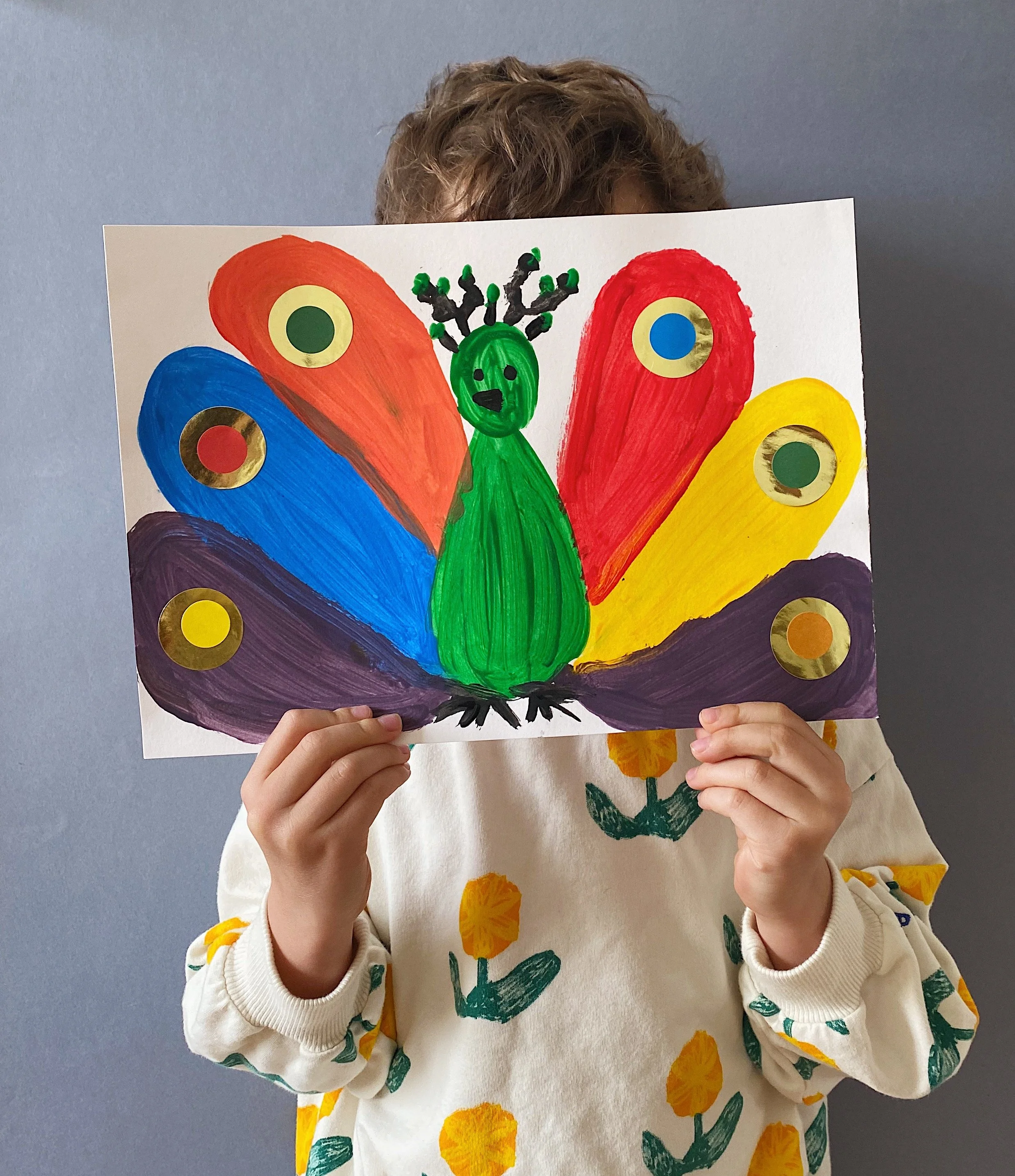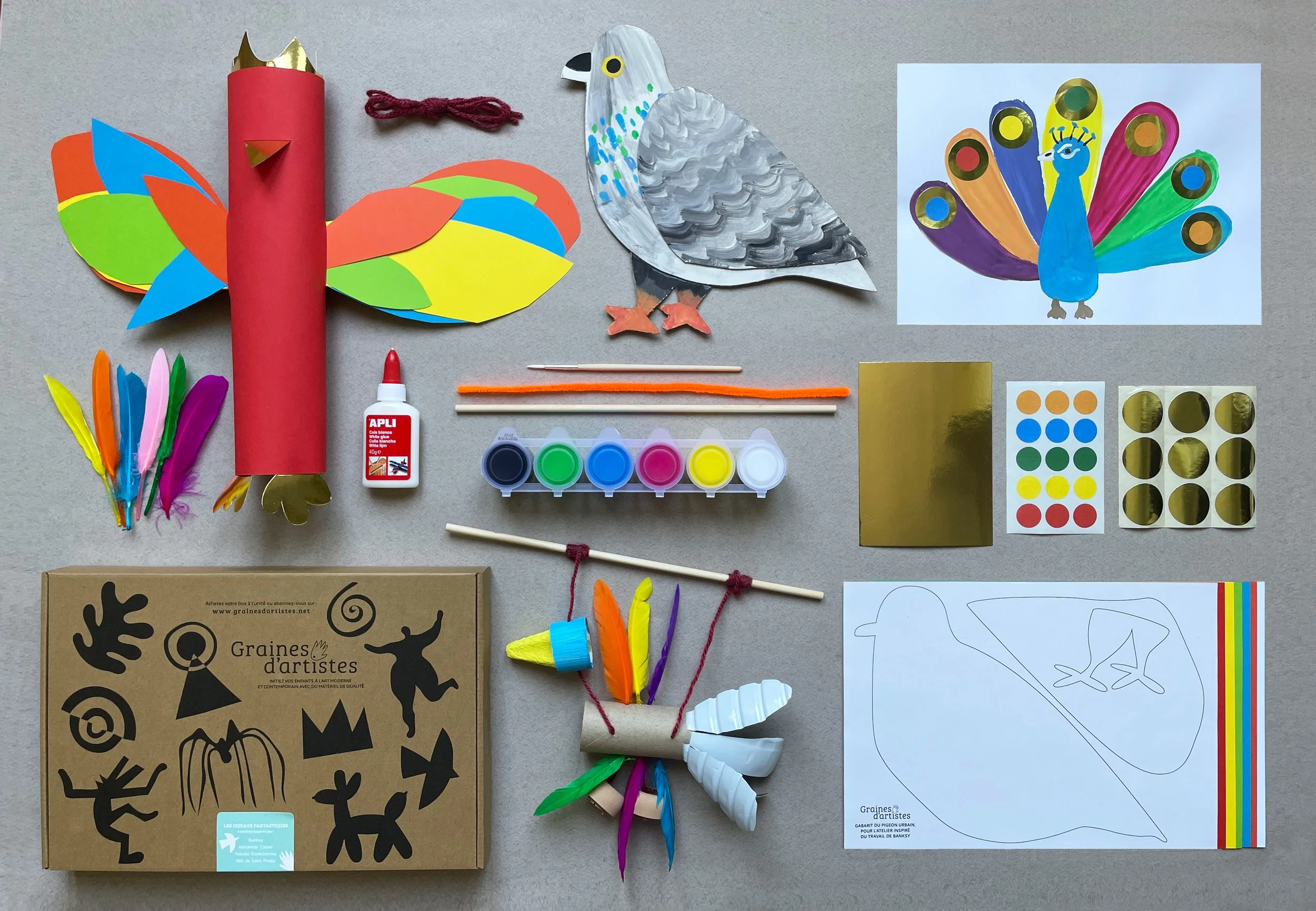 Les oiseaux existaient bien avant nous, ils auraient même côtoyé les dinosaures. Oui, tu as bien entendu : les dinosaures ! C’est pour cela qu’ils fascinent les humains depuis la nuit des temps. Nous admirons leurs habiletés naturelles que nous n’avons pas. L'homme a sans doute inventé l’avion car il avait envie de voler comme un oiseau, tu ne crois pas ? Dans l'art c’est un peu pareil, les oiseaux sont une source d’inspiration inépuisable... Nous t’en présentons 4 pour te montrer à quel point un seul animal peut être représenté vraiment différemment. On commence en réalisant un graffiti de pigeon inspiré du tagueur anglais Banksy, que tu placeras dans un endroit insolite. Ensuite avec l'inventeur ingénieux du mobile, Alexander Calder, tu vas créer en recyclant des matériaux issus de la poubelle. Tu continueras en fabriquant un totem de papier inspiré de la sculpture de l’Oiseau de feu de Niki de Saint Phalle. Puis tu dérouleras une queue de paon éclatante de gommettes, puisée dans les peintures folkloriques de Natalia Gontcharova. Prends tes jumelles, c’est parti pour une observation « art-nithologique » !